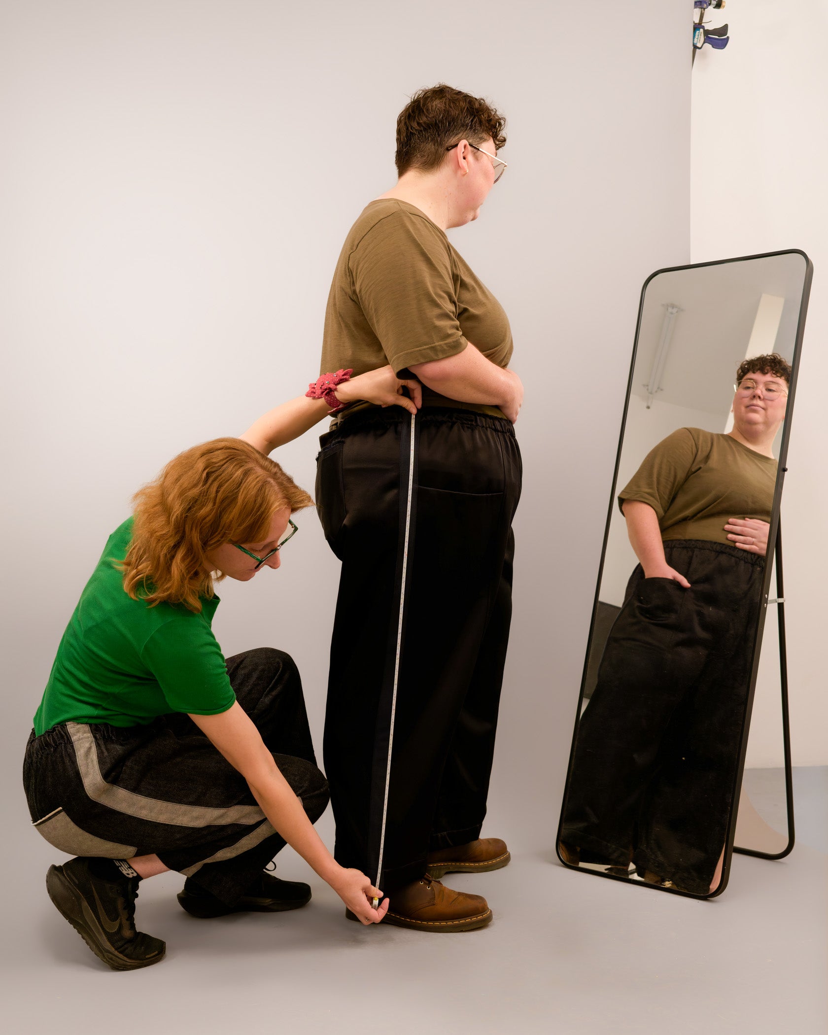 Custom fits start with a conversation. In person or over Zoom, we will talk about how to craft the perfect pair of pants to fit your measurements. If you’re not confident measuring yourself, don’t stress! I can walk you through the process and in 10 business days from your order, you’ll be wearing an item that has been specifically crafted for your body.